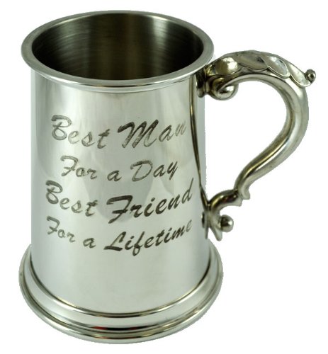 Enjoy your beer in a high quality Best Man Pewter Tankard Classic shape brightly polished finish Scroll handle pewter base The phrase best man for a day best friend for a lifetime is the main subject of this tankard and sets it apart as a special gift for that special person in the wedding pa