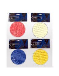 Foam coasters are lightweight durable and perfect for keepings tables or counters free of messes Each pack comes with 8 pieces Colors are assorted and include cream red yellow and blue Coasters come packaged in a poly bag with header card Coasters measure 4 wide This item is sold as an ass